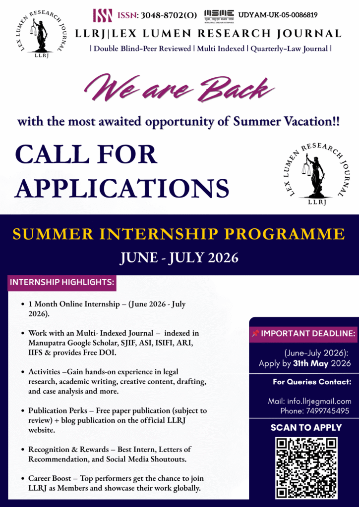 The LLRJ Summer Internship Programme 2026 is your chance to research, write, and publish with a globally indexed academic journal. Enhance your profile, gain recognition, and work directly with the Editorial Board of LLRJ.